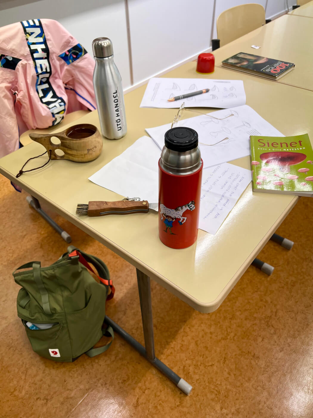 Eka kouluaamu alkoi yllättävästi Tuorlan rantasaunalla. Viritimme tulet, veistimme nuotiotikut, loihdimme tikkupullataikinan, sekä nokipannukaffet. Nuotion äärellä, herkkuja nauttiessa, tutustuimme toisiimme. Tällainen koulu on mun mieleen! Ensimmäisellä kouluviikolla alkoi myös lajitunnistuksen opetus. Monta sivua kasveja, sieniä, ja eläimiäkin tunnistettavaksi. Aikamoinen savotta, mutta pieneksi pilkottuna uppoutunee muistini lokeroihin pikkuhiljaa. Opetustapa kun on minulle mieleinen, mahdollisimman paljon aitoa havannointia. Kasviopin tunnilla lajittelimme ja tunnistimme vesikasveja, sekä luokassa että luonnossa. Sieniin tutustuimme sieniretkellä ja luokassa jatkoimme jälleen lajittelua ja tunnistusta. Näin kyllä oppii parhaiten.