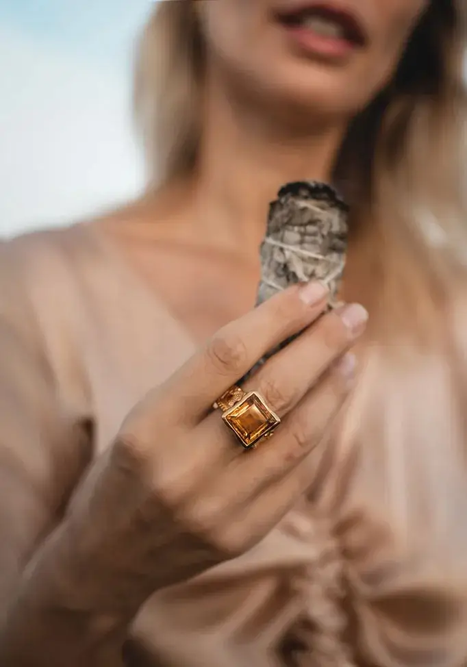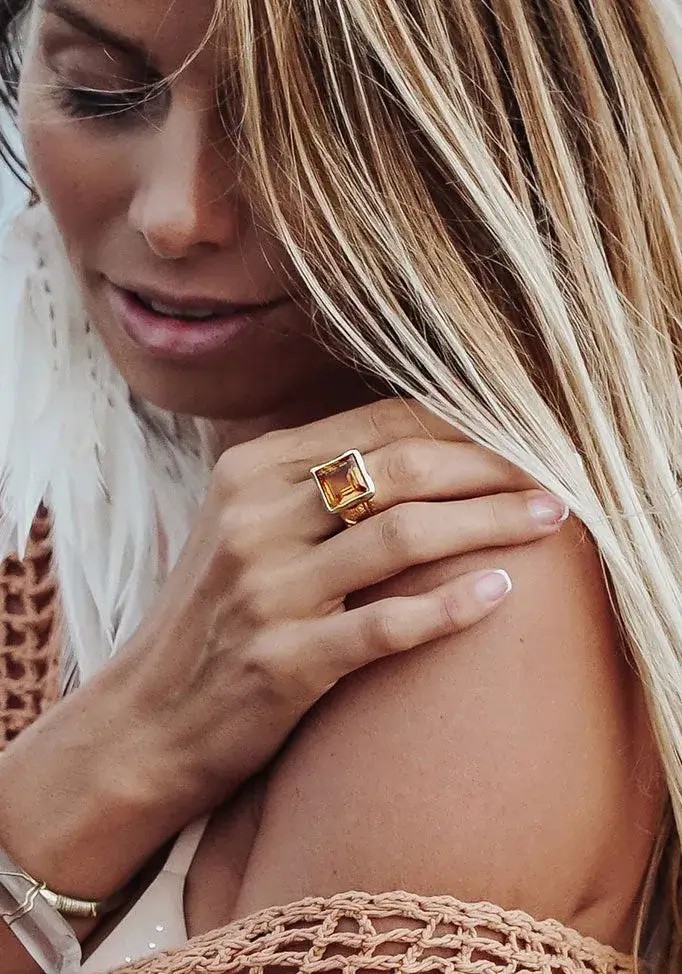 Tarkasti ja huolellisesti työstetty Citrine Royalty Sormus on valmistettu 18k kullatusta messingistä, mikä varmistaa sen kestävyyden ja kestävän kauneuden. Kun käytät tätä sormusta, et vain koristele itseäsi hienoilla koruilla; sinusta tulee osa tarinaa, joka juhlii eettistä käsityötaitoa, totuutta ja kuninkaallisten viehätystä.