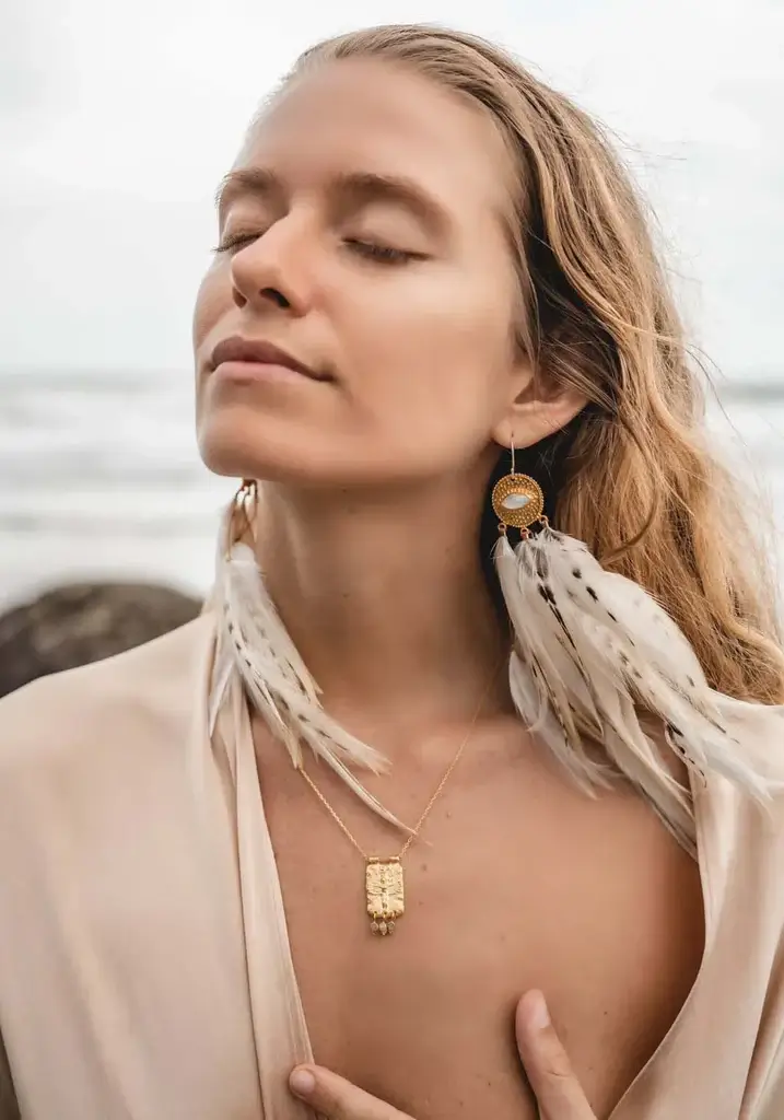 Keskellä korvakorua on kuukivi, joka on istutettu 24k kullatulle (messinki) amuletille. Rauhoittava kuukivi antaa sinun heittäytyä elämän vietäväksi.