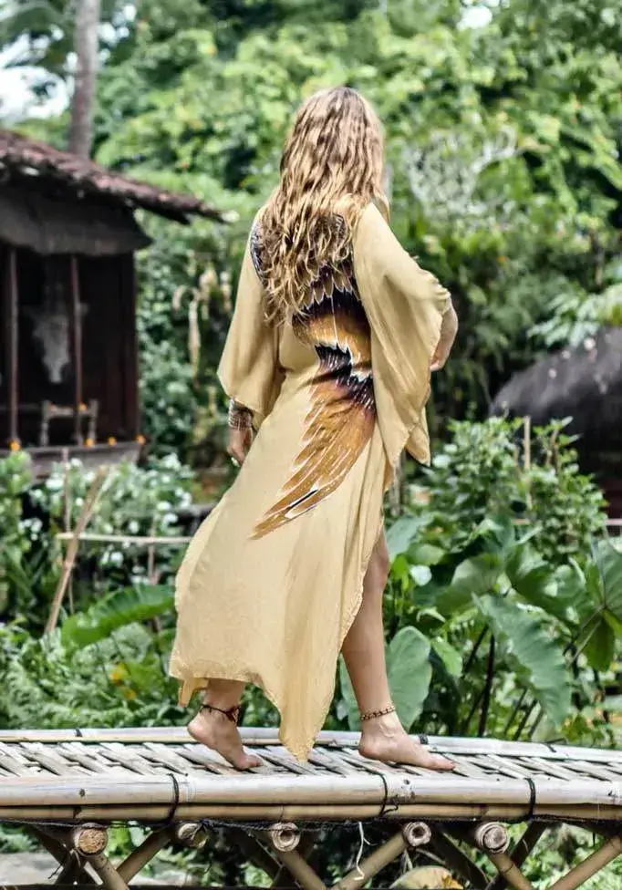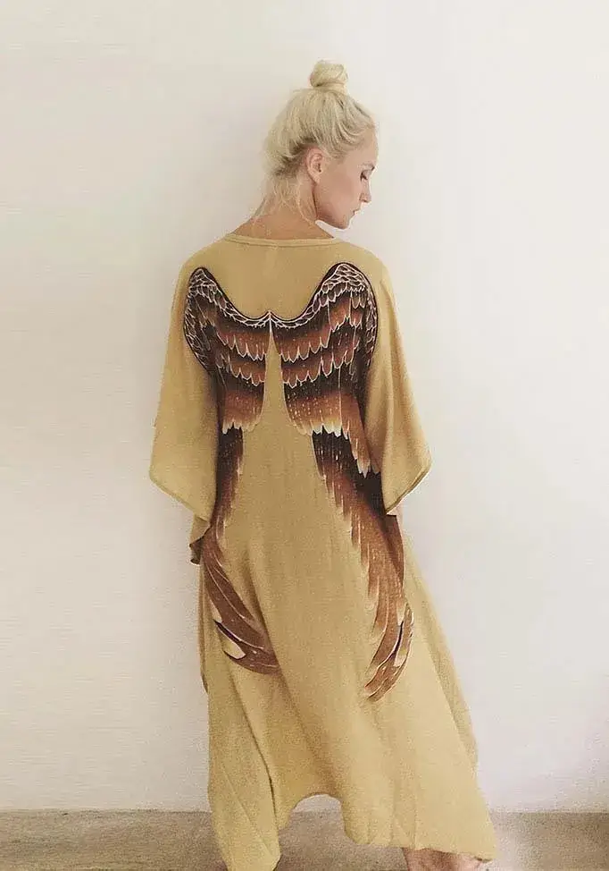 Short-Long Angel Wing Kaftan Viscose – käsinmaalattu, taitavan hienostunut kaftaani upein enkelinsiivin. Kaftaani on edestä lyhyt ja takaa pitkä.