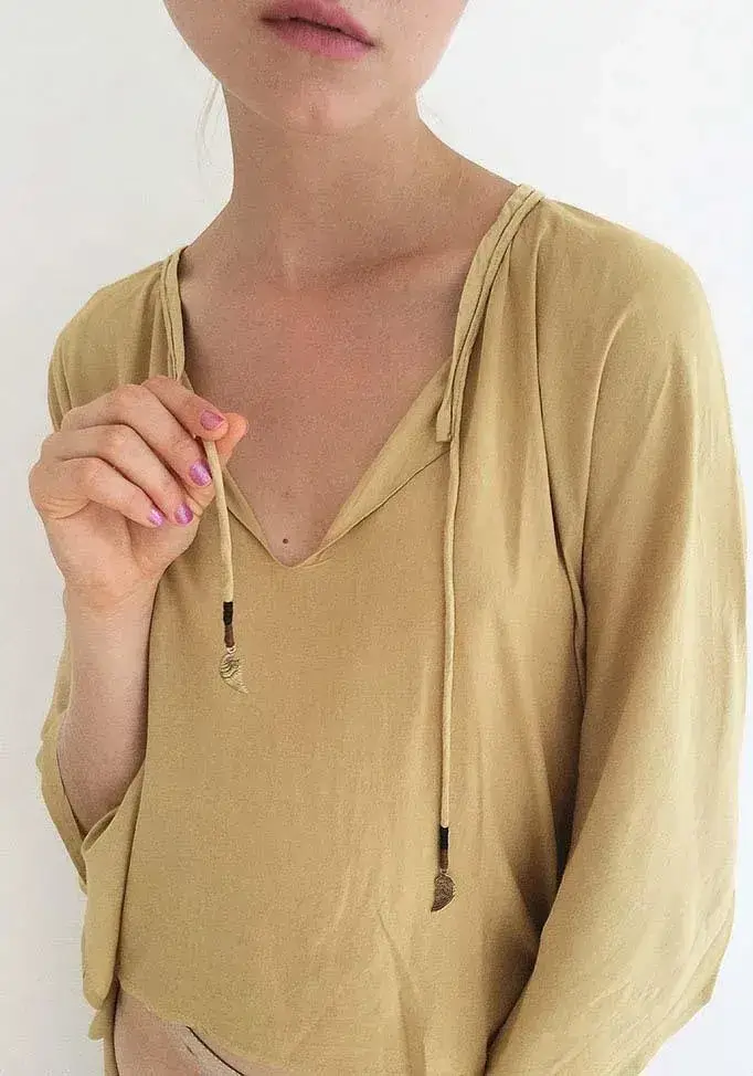 Tässä Kaftanissa on lyhyt etuosa nauhoilla, joissa on tunnusomaiset messinkiset siipi-yksityiskohdat.