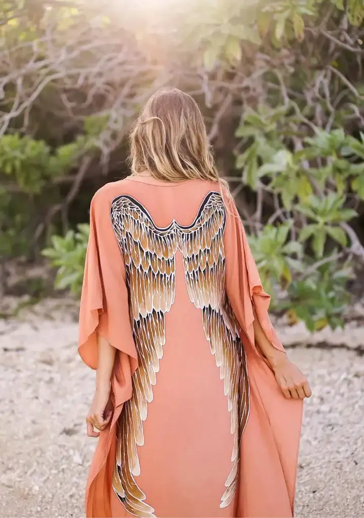 Short-Long Angel Wing Kaftan Viscose – käsinmaalattu, taitavan hienostunut kaftaani upein enkelinsiivin. Kaftaani on edestä lyhyt ja takaa pitkä.